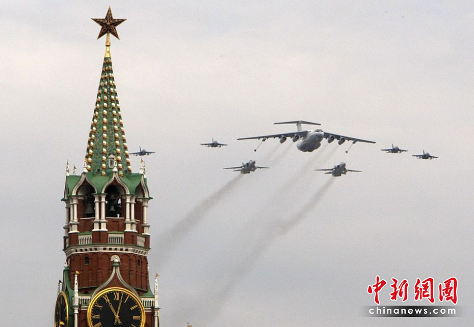當(dāng)?shù)貢r(shí)間5月4日,在俄羅斯首都莫斯科,參加彩排的戰(zhàn)機(jī)編隊(duì)飛過紅場上空。俄羅斯將于5月9日隆重紀(jì)念衛(wèi)國戰(zhàn)爭勝利65周年。圖片來源:中國新聞網(wǎng)