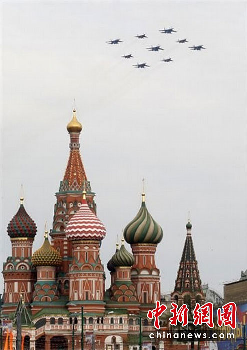 當(dāng)?shù)貢r(shí)間5月4日,在俄羅斯首都莫斯科,參加彩排的戰(zhàn)機(jī)編隊(duì)飛過(guò)紅場(chǎng)上空。俄羅斯將于5月9日隆重紀(jì)念衛(wèi)國(guó)戰(zhàn)爭(zhēng)勝利65周年。圖片來(lái)源:中國(guó)新聞網(wǎng)
