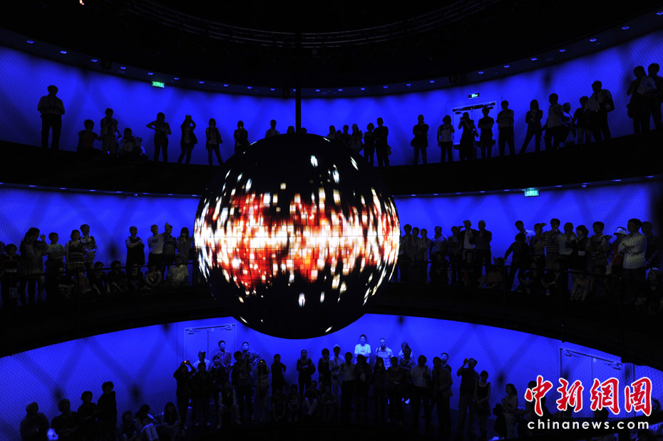 德國館的高潮就是它的最后部分“動力之源”?梢匀菁{600人的動力之源大廳圓形環(huán)廊是一個圓錐形空間,中間懸掛著一個重達(dá)1.5噸、直徑達(dá)3米的巨大金屬球,四周則有一圈供游客駐足的走廊。黑漆漆的大廳里,兩個虛擬主持人邀請觀眾同時大聲吶喊。隨著吶喊聲的加大,動力球慢慢擺動起來,聲音越大擺動幅度越大,甚至繞圈飛行。圓球表面40萬根發(fā)光的LED管,逐漸閃現(xiàn)出德國人對未來城市生活的暢想畫面。這是一場7分鐘的互動體驗。在這里觀眾才是主角。中新網(wǎng)記者 王紅綱 攝