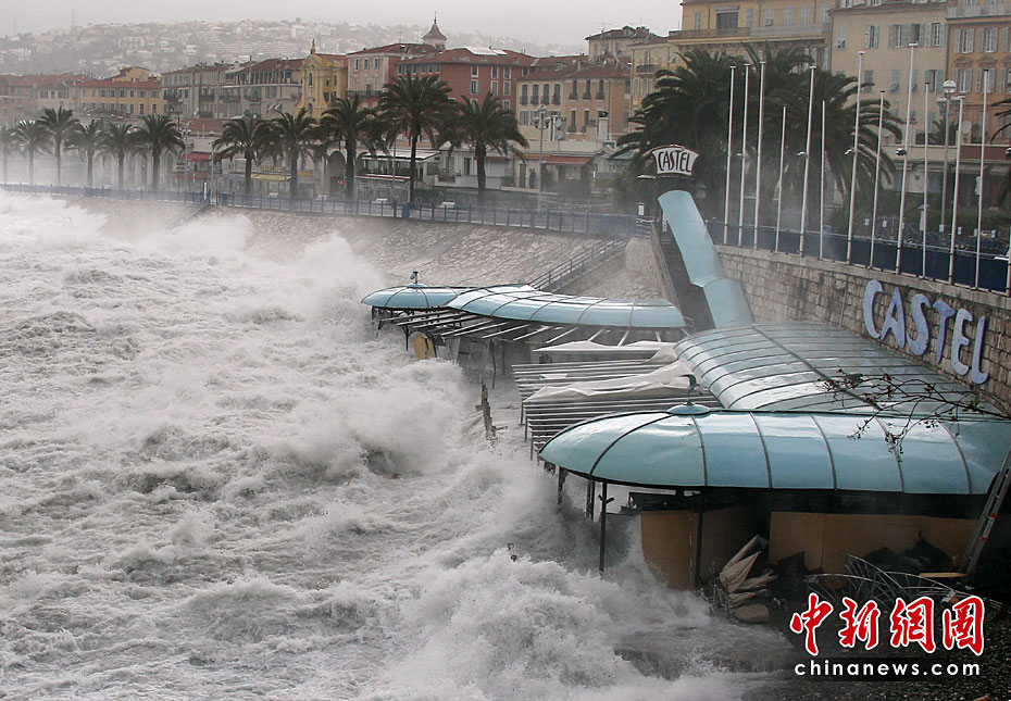 近日,在法國南部城市尼斯,巨浪襲擊城市的海岸后造成城市道路癱瘓。法國南部部分地區(qū)遭遇大風(fēng)和巨浪,使當(dāng)?shù)亟煌ê凸╇娛艿讲煌潭鹊挠绊。圖片來源:中國新聞網(wǎng)