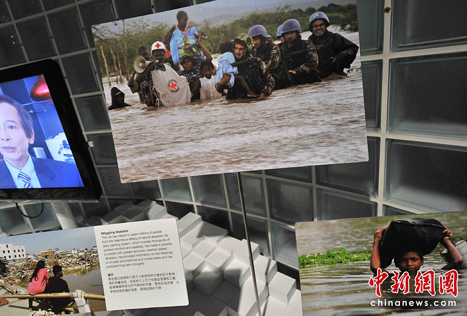 一所藍(lán)色的簡(jiǎn)樸平房,在5月開(kāi)園的上海世博會(huì)大道邊上,極不顯眼。但是,聯(lián)合國(guó)聯(lián)合館的鮮明會(huì)標(biāo),特別吸引人。這個(gè)展館集中了世界衛(wèi)生組織、世界銀行和聯(lián)合國(guó)的兒童基金會(huì)、糧農(nóng)組織、教科文組織等22個(gè)機(jī)構(gòu)。圖片來(lái)源:中國(guó)新聞網(wǎng) 賈國(guó)榮 攝