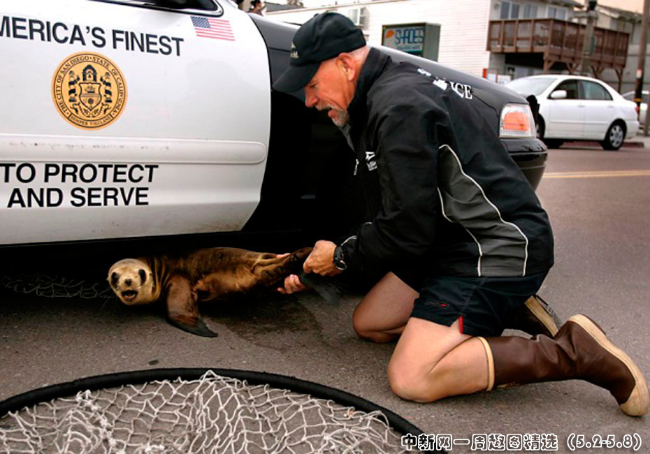 5月5日,在加利福尼亞州,動物護(hù)理專家羅賓森把一頭小海豹從圣地亞哥警車下拖出。小海豹之前在另一輛車下被發(fā)現(xiàn),看到警察要捉它就躲到了這輛警車下。圖片來源:中國新聞網(wǎng)>>點(diǎn)擊觀看詳細(xì)內(nèi)容