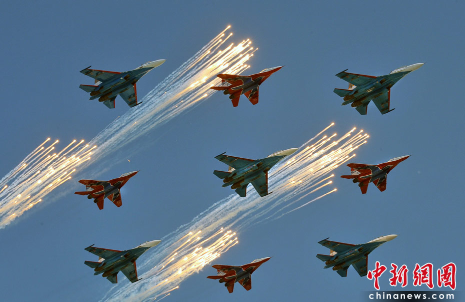 5月9日,俄羅斯在莫斯科紅場舉行盛大的閱兵式,慶祝衛(wèi)國戰(zhàn)爭勝利65周年。莫斯科時間5月9日上午10點(北京時間9日下午2點)許,閱兵式正式開始。圖為空中梯隊飛越紅場上空。