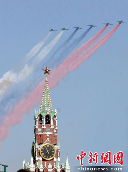 5月9日,俄羅斯在莫斯科紅場(chǎng)舉行盛大的閱兵式,慶祝衛(wèi)國(guó)戰(zhàn)爭(zhēng)勝利65周年。莫斯科時(shí)間5月9日上午10點(diǎn)(北京時(shí)間9日下午2點(diǎn))許,閱兵式正式開始。6架蘇-25強(qiáng)擊機(jī)在紅場(chǎng)上空噴出象征俄羅斯國(guó)旗白、藍(lán)、紅三色的煙霧。中新社發(fā) 田冰 攝