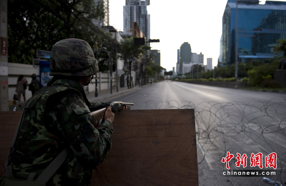 泰國軍隊和反政府的“紅衫軍”16日繼續(xù)在曼谷的多處地點對峙,槍聲和爆炸聲不時響起,曼谷的部分街道已成為“戰(zhàn)區(qū)”。泰國急救醫(yī)療部門17日表示,泰國軍警與反政府“紅衫軍”示威民眾3天來在曼谷街頭爆發(fā)的沖突,死亡人數(shù)已經上升到35人。圖片來源:中國新聞網