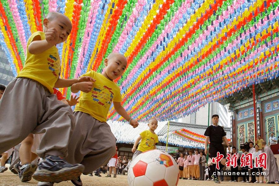 2010年5月15日,韓國首爾曹溪寺院舉行了兒童足球賽,一群四五歲的孩子和小和尚參加了這場足球友誼賽。這場比賽是佛誕節(jié)活動(dòng)的一部分,也是為了迎接2010世界杯足球賽的到來。Chung Sung-Jun
