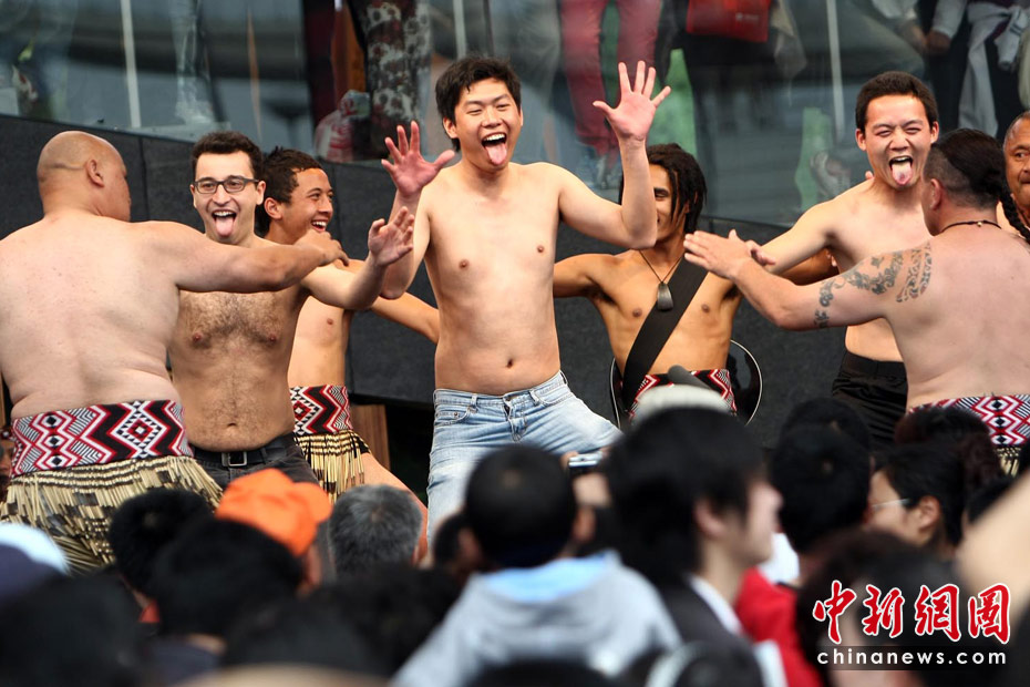 5月初,游客在上海世博會新西蘭館前赤膊上陣學(xué)跳毛利舞。中新社記者 杜洋 攝