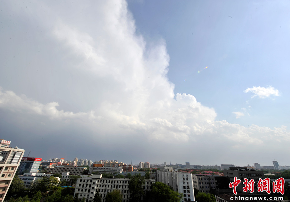 5月18日16時(shí)許,伴隨陣陣?yán)茁暰┏峭唤荡笥辏涤赀^(guò)后東部天空依然籠罩著烏云,而西邊卻已放晴。中新網(wǎng)記者 金碩 攝