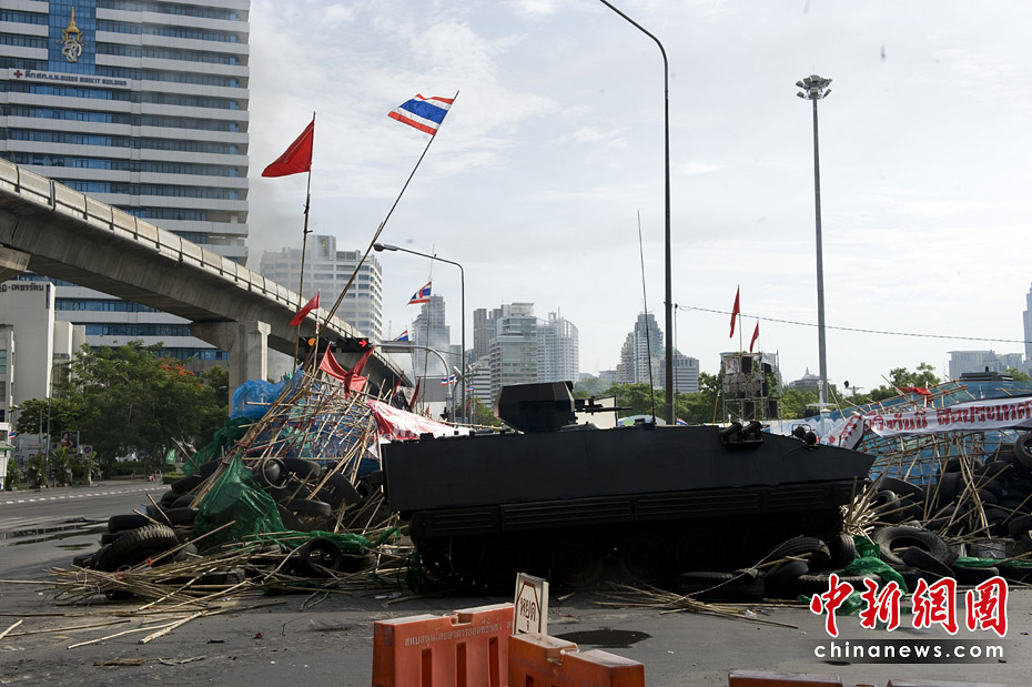 19日泰國(guó)軍方對(duì)聚集在首都曼谷市示威的反政府“紅衫軍”展開了驅(qū)散行動(dòng)。軍方裝甲車已突破“紅衫軍”所筑路障,且至少有3人被槍擊中。圖片來(lái)源:中國(guó)新聞網(wǎng)