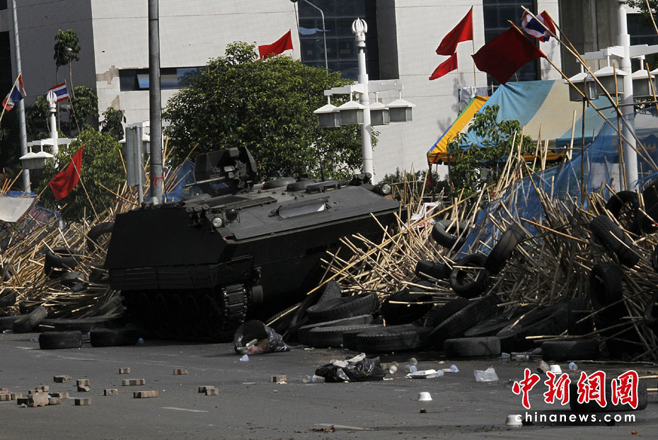 19日泰國軍方對聚集在首都曼谷市示威的反政府“紅衫軍”展開了驅散行動。軍方裝甲車已突破“紅衫軍”所筑路障,且至少有3人被槍擊中。圖片來源:中國新聞網