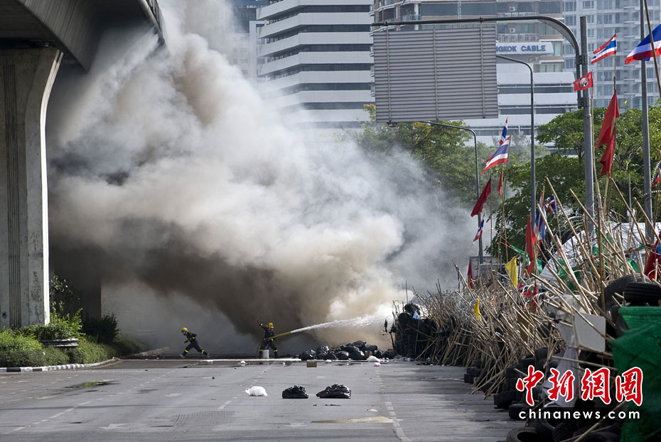 19日泰國(guó)軍方對(duì)聚集在首都曼谷市示威的反政府“紅衫軍”展開(kāi)了驅(qū)散行動(dòng)。軍方裝甲車(chē)已突破“紅衫軍”所筑路障,且至少有3人被槍擊中。圖片來(lái)源:中國(guó)新聞網(wǎng)