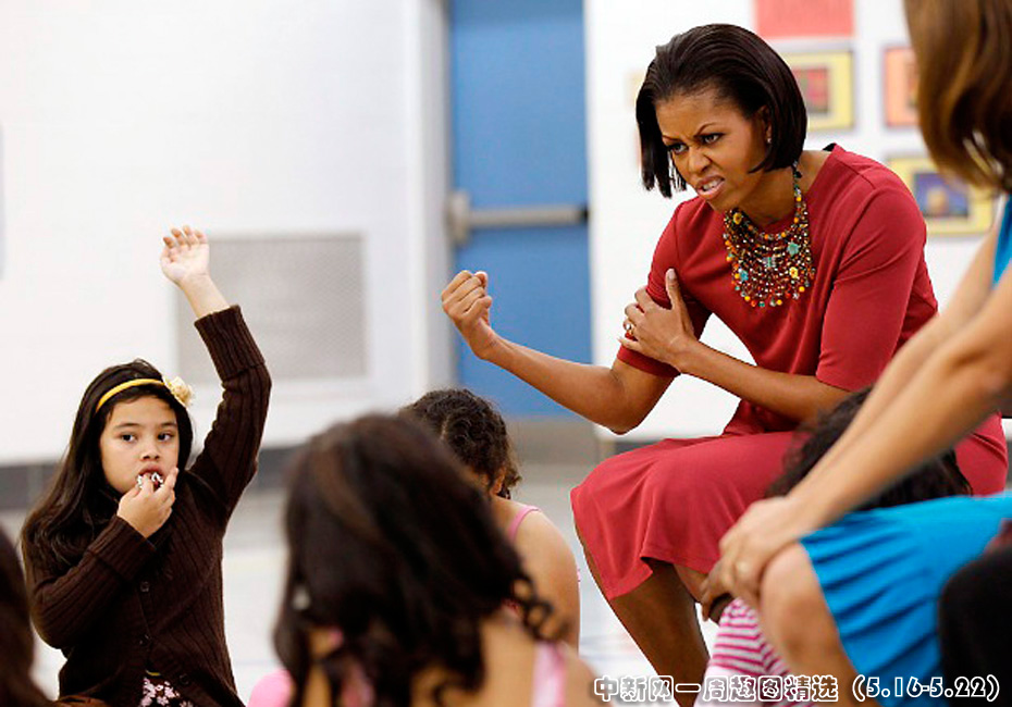 近日,美國(guó)第一夫人米歇爾·奧巴馬到馬里蘭州銀泉小學(xué)看望學(xué)生。在體育課上,米歇爾彎曲胳膊繃緊肌肉。圖片來(lái)源:中國(guó)新聞網(wǎng)