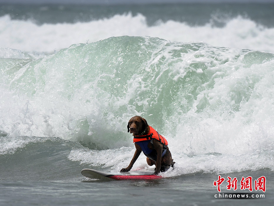 5月22日,美國(guó)加利福尼亞州圣迭戈舉行了一場(chǎng)妙趣橫生的狗狗沖浪比賽。圖片來(lái)源:中國(guó)新聞網(wǎng)