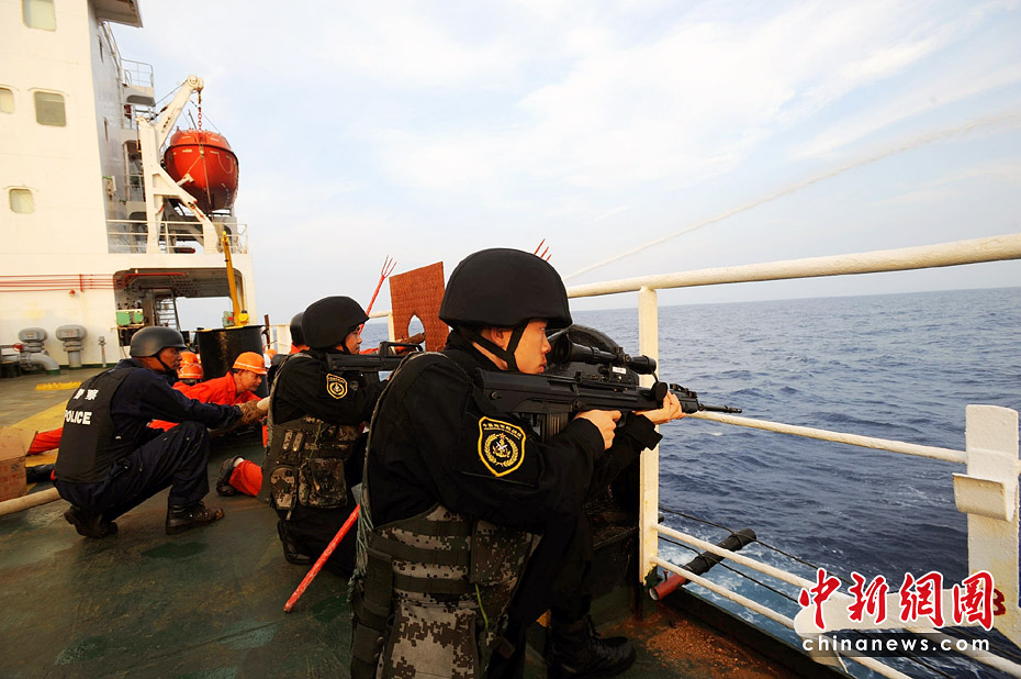 4月15日傍晚,在特戰(zhàn)隊(duì)員現(xiàn)場(chǎng)指揮下,軍民聯(lián)合反海盜演練在“嘉永山”輪船上甲板緊張有序地展開。江山 攝