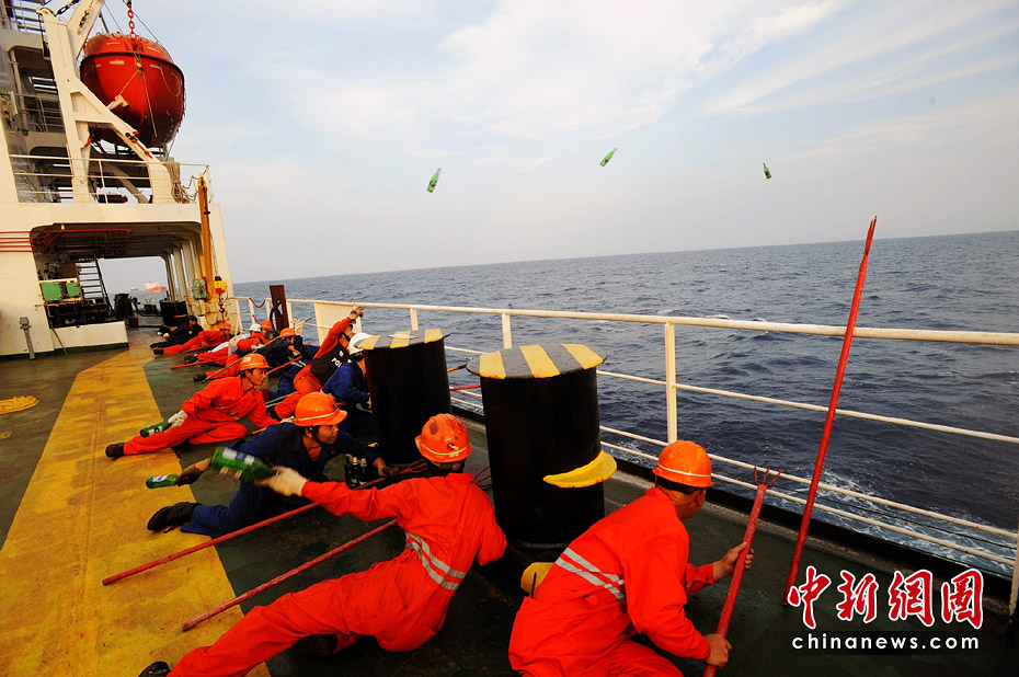 有特戰(zhàn)隊(duì)員在身邊,增強(qiáng)了船員反海盜信心。圖為演練時(shí),船員進(jìn)行投擲啤酒瓶訓(xùn)練。江山 攝