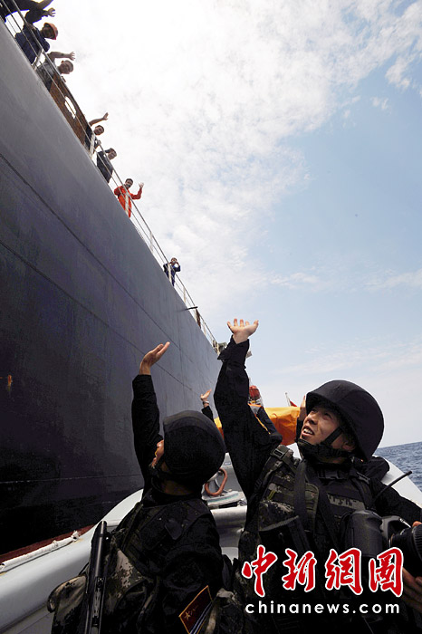 4月16日當(dāng)?shù)貢r(shí)間11時(shí),第五批護(hù)航編隊(duì)圓滿完成第188批護(hù)航任務(wù),在“嘉永山”輪船實(shí)施隨船護(hù)衛(wèi)的4名特戰(zhàn)隊(duì)員換乘小艇離開時(shí),船員紛紛來到甲板與他們揮手告別。江山 攝