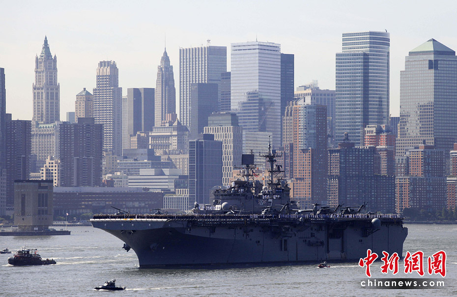 當(dāng)?shù)貢r(shí)間5月26日,美國(guó)第23屆紐約艦隊(duì)周開(kāi)幕,包括“硫磺島”號(hào)兩棲攻擊艦在內(nèi)的11艘參加艦隊(duì)周活動(dòng)的軍艦由南向北在哈得孫河面上游弋。紐約民眾將以?吭诼D哈得孫河86號(hào)碼頭的“無(wú)畏號(hào)”航母博物館為中心,展開(kāi)為期一周的慶祝和紀(jì)念活動(dòng)。圖片來(lái)源:中國(guó)新聞網(wǎng)