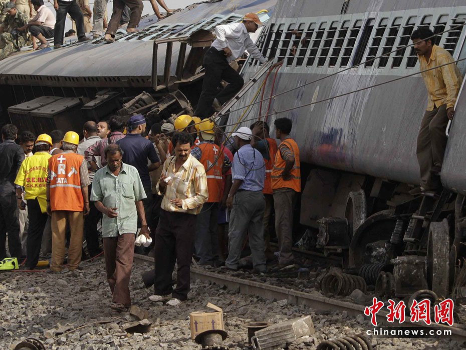 當?shù)貢r間5月28日,印度一列特快列車在東部西孟加拉邦的西米德納布爾遭反政府武裝襲擊脫軌,造成百余人死傷。圖片來源:中國新聞網(wǎng)