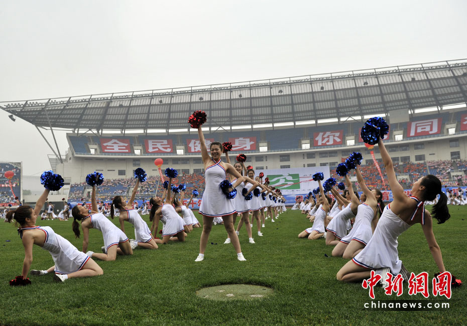 中央國家機(jī)關(guān)第三屆職工運(yùn)動(dòng)會(huì)今日在北京國家奧林匹克體育中心正式開幕。90多個(gè)中央國家機(jī)關(guān)部門參加開幕式,中共中央政治局常委、國務(wù)院副總理李克強(qiáng)出席活動(dòng)。圖為開幕式上的健身操表演。中新網(wǎng)記者 金碩 攝