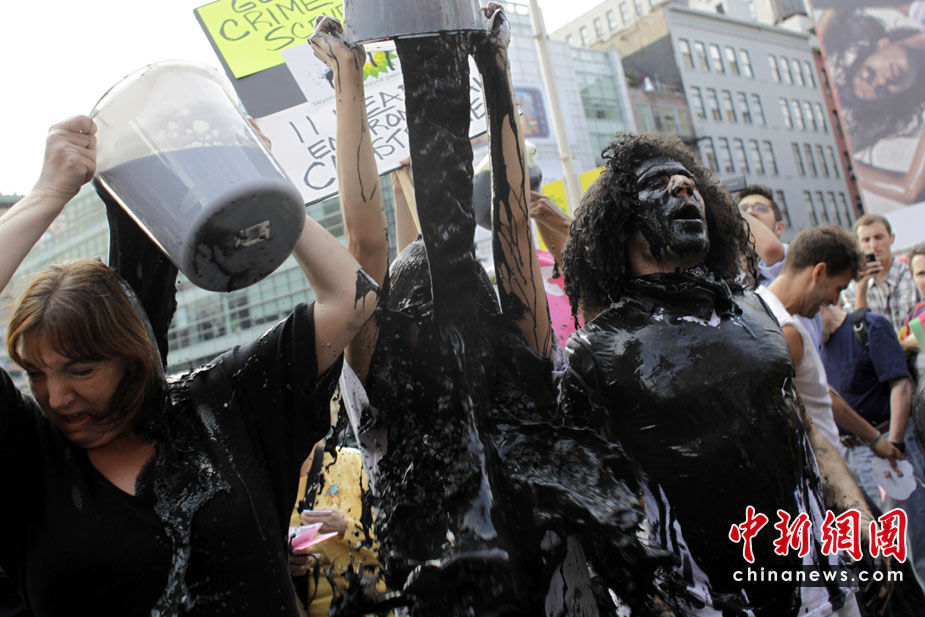 5月28日,美國環(huán)保主義者在紐約曼哈頓的一家加油站前,身上涂灑黑色顏料,以此抗議墨西哥灣原油不斷泄露。