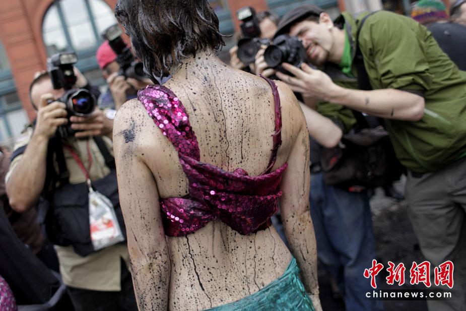 5月28日,美國(guó)環(huán)保主義者在紐約曼哈頓的一家加油站前,身上涂灑黑色顏料,以此抗議墨西哥灣原油不斷泄露。