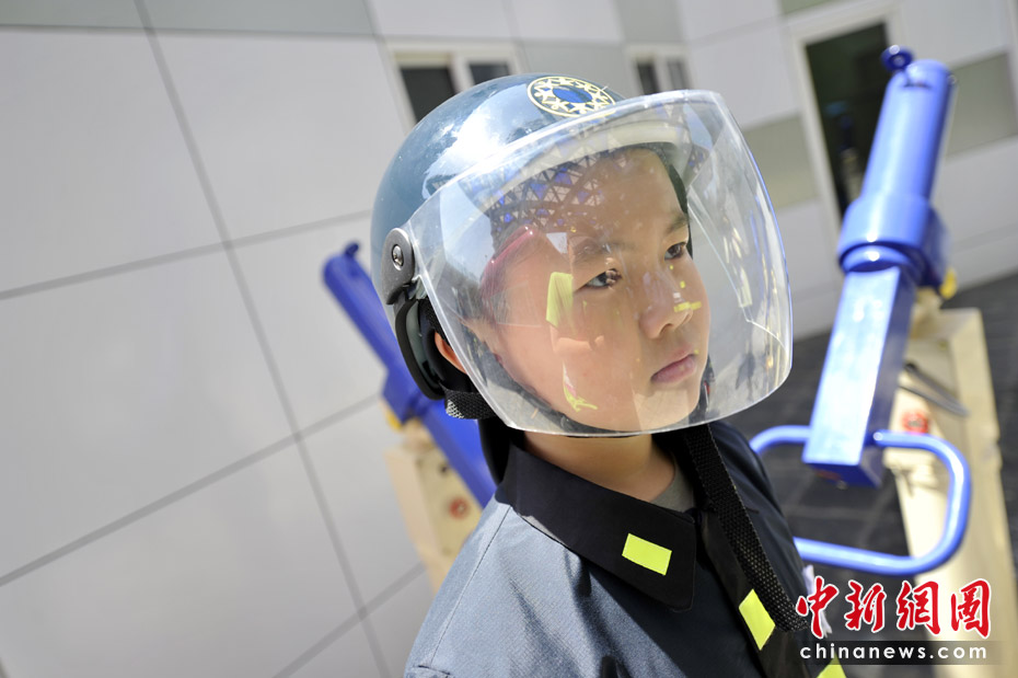 圖為一個孩子在體驗消防員的角色。 中新網(wǎng)記者 王紅綱 攝