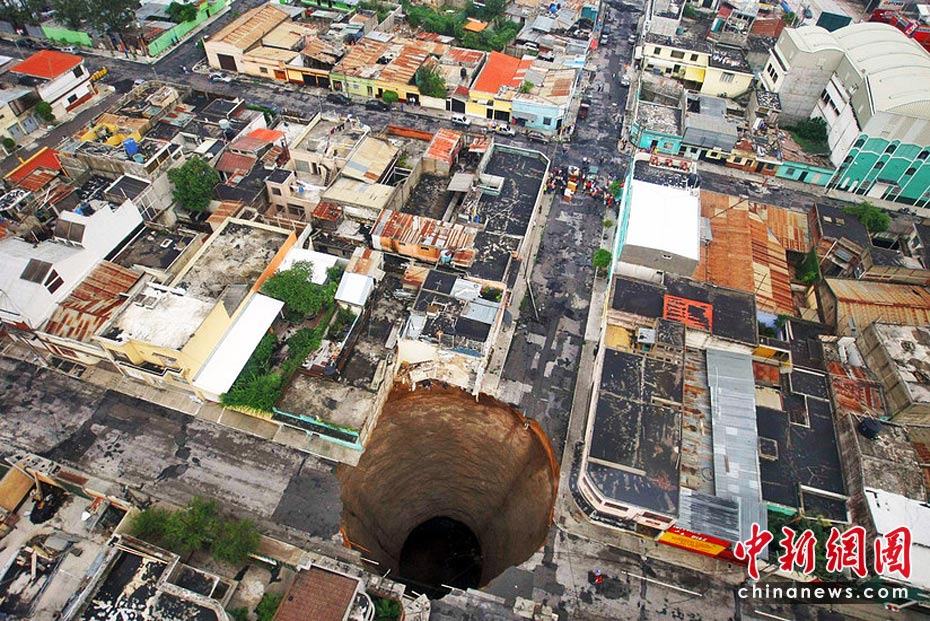 5月31日,受颶風(fēng)“阿加莎”的影響,危地馬拉首都危地馬拉城出現(xiàn)一個(gè)深達(dá)60米塌陷洞,有目擊稱一幢3層建筑墜入洞中,至少造成1人死亡。圖片來(lái)源:中國(guó)新聞網(wǎng)