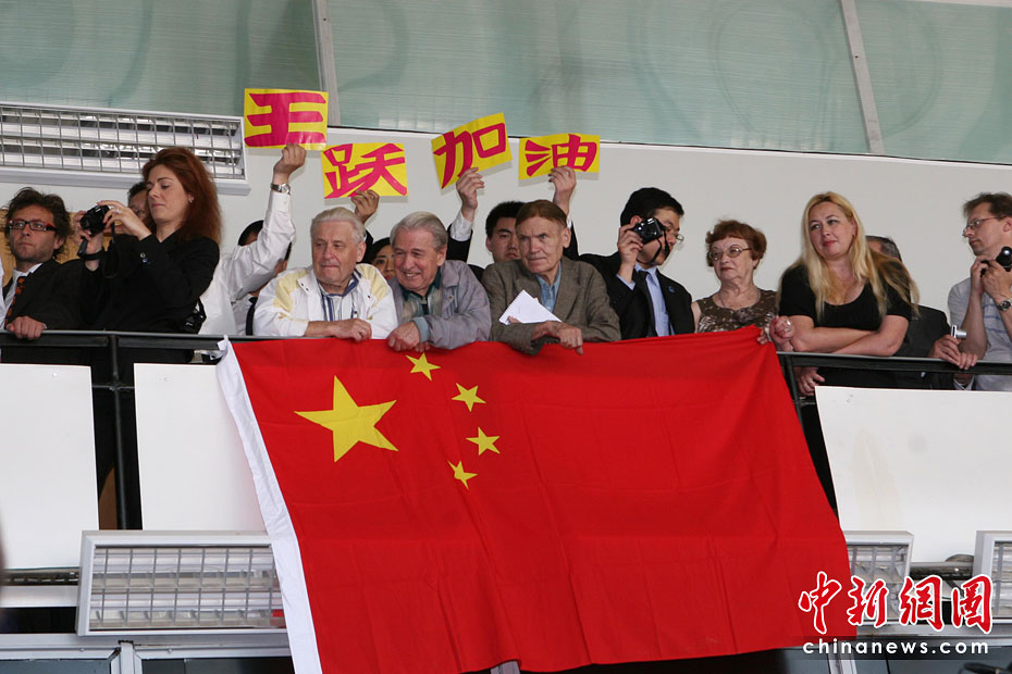 當(dāng)?shù)貢r(shí)間6月3日14時(shí),“火星-500”實(shí)驗(yàn)艙最后一道艙門(mén)關(guān)閉,人類(lèi)歷史上首次模擬火星載人航天飛行試驗(yàn)就此拉開(kāi)帷幕。中國(guó)參試項(xiàng)目團(tuán)隊(duì)現(xiàn)場(chǎng)為王躍加油。中新社記者 田冰 攝