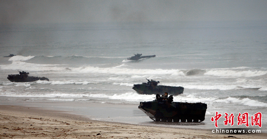 當(dāng)?shù)貢r(shí)間6月4日,約5000名水兵和陸戰(zhàn)隊(duì)員在美國加利福尼亞州舉行了代號為“黎明突擊”的搶灘登陸軍事演習(xí)。圖片來源:中國新聞網(wǎng)