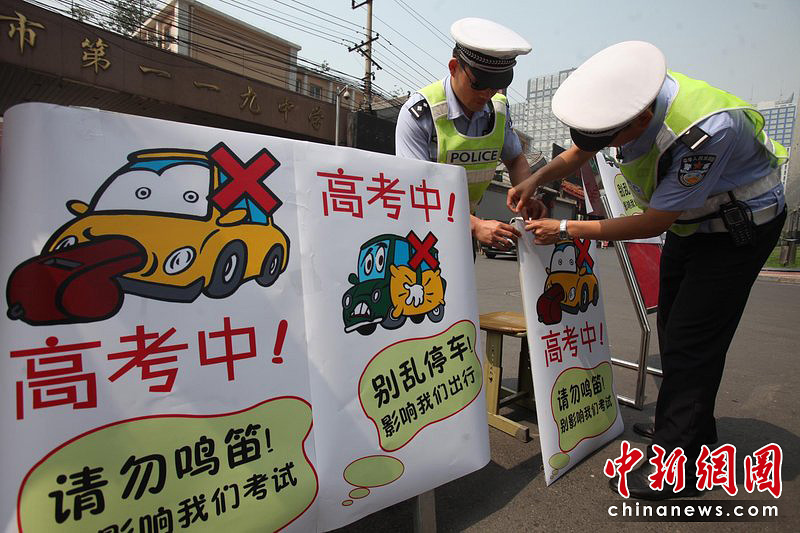 6月4日,北京,朝陽(yáng)交通支隊(duì)交警正在試擺卡通提示牌。揚(yáng)威/CFP