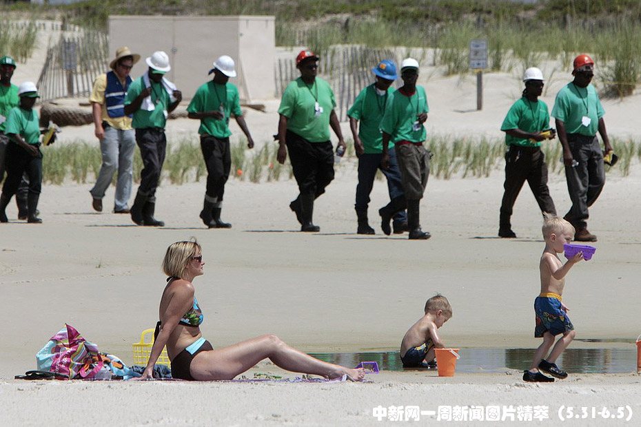 周二(1日),美國阿拉巴馬州海岸,人們?cè)诤_厱裉,石油工人在后面走過。墨西哥灣漏油事件已經(jīng)開始影響到該地區(qū)的旅游。