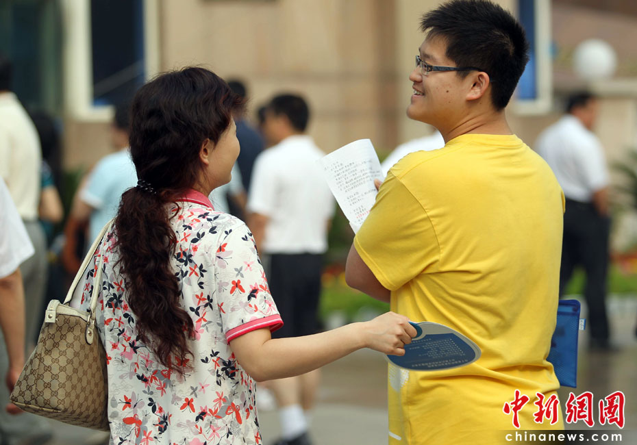 2010年全國高考6月7日日拉開大幕,957萬考生走進(jìn)考場(chǎng)。由于報(bào)名人數(shù)減少,而招生計(jì)劃增加,教育部預(yù)計(jì)今年全國高考平均錄取率將會(huì)增加近7%。圖為母親為兒子扇風(fēng)降溫。中新社發(fā) 蘇丹 攝
