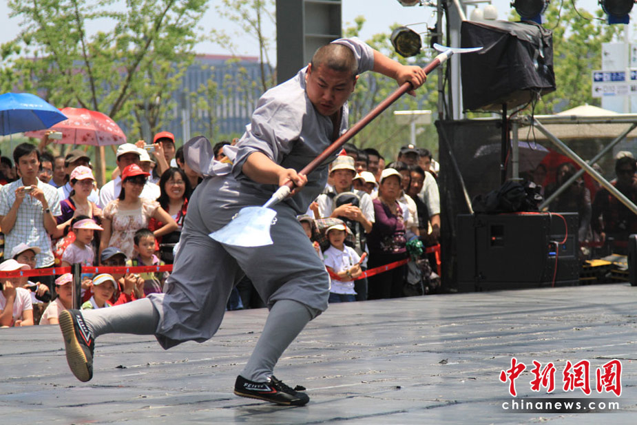 自5月1日開(kāi)始,上海世博園D片區(qū)綜藝廣場(chǎng)每天都有少林寺功夫展演,受到世博參觀者的熱捧。中新社記者 殷春永攝