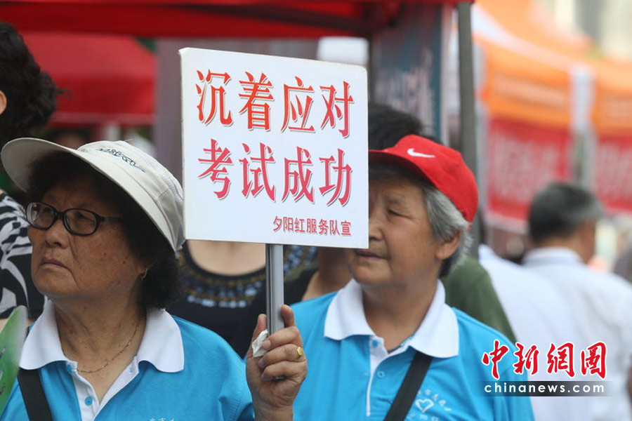 6月7日,為期兩天的2010年普通高等學(xué)校招生全國統(tǒng)一考試開考,全國將有957萬考生走進(jìn)考場。圖為在哈爾濱一考點(diǎn)外,夕陽紅服務(wù)隊(duì)的老人舉起牌子鼓勵考生。小剛 攝