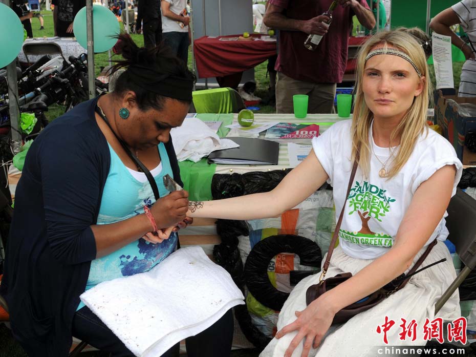 當?shù)貢r間2010年6月6日,英國倫敦舉行卡姆登綠色市集(Camden Green Fair),這是英國倫敦每年環(huán)保領(lǐng)域的“重頭戲”。本屆市集的主旨是要喚起大眾對環(huán)境問題的關(guān)注,選擇更加可持續(xù)發(fā)展的生活方式。據(jù)活動主辦方預(yù)計,本屆市集將吸引來自英國各地和世界各國的2萬多人參加。圖為本次活動的組織者Sinclair Eiloart(右)在體驗印度手繪藝術(shù)。Fiona/攝 Fiona 馬小剛/文