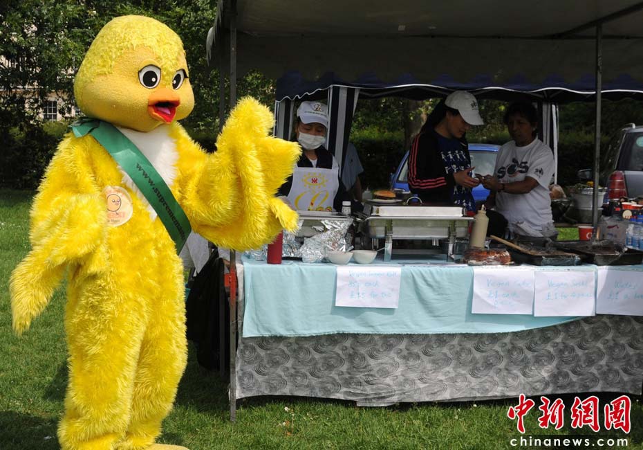 當(dāng)?shù)貢r(shí)間2010年6月6日,英國倫敦舉行卡姆登綠色市集(Camden Green Fair),這是英國倫敦每年環(huán)保領(lǐng)域的“重頭戲”。本屆市集的主旨是要喚起大眾對(duì)環(huán)境問題的關(guān)注,選擇更加可持續(xù)發(fā)展的生活方式。據(jù)活動(dòng)主辦方預(yù)計(jì),本屆市集將吸引來自英國各地和世界各國的2萬多人參加。圖為打扮成小雞的素食主義者宣傳素食。Fiona/攝 Fiona 馬小剛/文