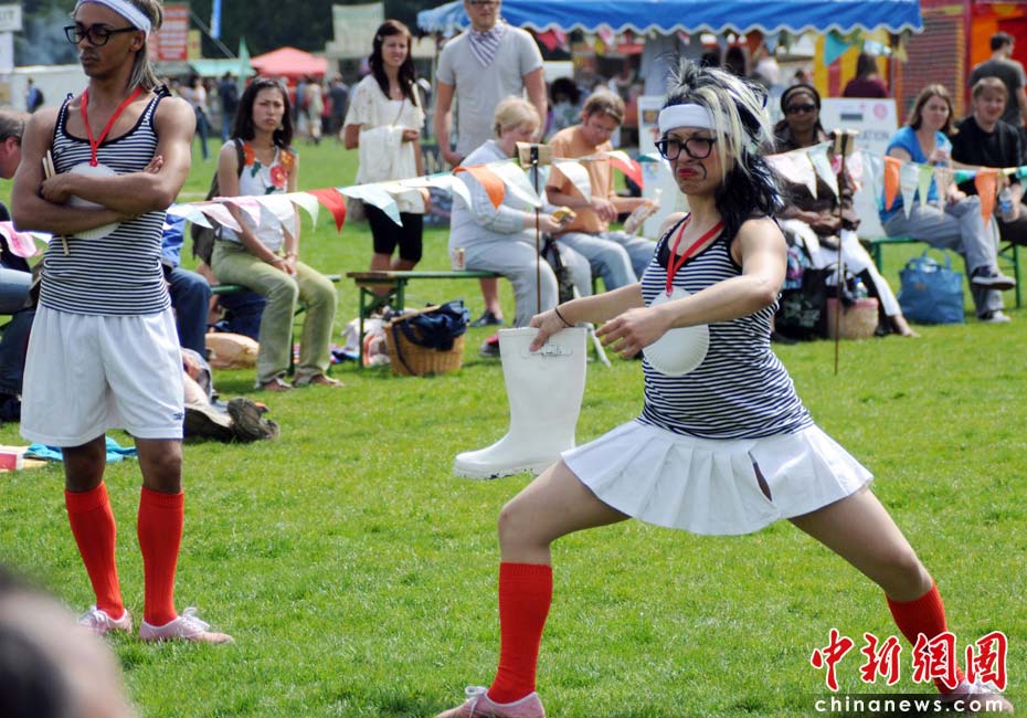 當(dāng)?shù)貢r間2010年6月6日,英國倫敦舉行卡姆登綠色市集(Camden Green Fair),這是英國倫敦每年環(huán)保領(lǐng)域的“重頭戲”。本屆市集的主旨是要喚起大眾對環(huán)境問題的關(guān)注,選擇更加可持續(xù)發(fā)展的生活方式。據(jù)活動主辦方預(yù)計,本屆市集將吸引來自英國各地和世界各國的2萬多人參加。圖為活動志愿者組織大家玩兒傳統(tǒng)的夏季游戲“扔靴賽”。Fiona/攝 Fiona 馬小剛/文