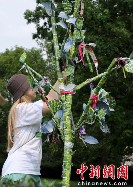 當(dāng)?shù)貢r(shí)間2010年6月6日,英國(guó)倫敦舉行卡姆登綠色市集(Camden Green Fair),這是英國(guó)倫敦每年環(huán)保領(lǐng)域的“重頭戲”。本屆市集的主旨是要喚起大眾對(duì)環(huán)境問(wèn)題的關(guān)注,選擇更加可持續(xù)發(fā)展的生活方式。據(jù)活動(dòng)主辦方預(yù)計(jì),本屆市集將吸引來(lái)自英國(guó)各地和世界各國(guó)的2萬(wàn)多人參加。圖為用回收的廢舊紙張制作的“小樹(shù)”。該樹(shù)由年輕的倫敦園藝設(shè)計(jì)師Sarah Veniard設(shè)計(jì)。她的設(shè)計(jì)理念是“美麗的可持續(xù)空間”。她認(rèn)為只要有充足的陽(yáng)光,陽(yáng)臺(tái)也可以變成一個(gè)集水果蔬菜和觀賞植物于一身的多功能花園。Sarah是純素食主義者,她結(jié)合顧客要求設(shè)計(jì)的瓜果園非常受歡迎。Fiona/攝 Fiona 馬小剛/文