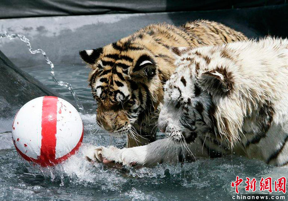 2010年6月7日,美國南卡羅來納州美特爾海灘,在世界杯即將開幕之際,一歲的小白虎Sundaram和孟加拉虎Mukti率先在水里上演了一出足球大戲。英格蘭隊(duì)首戰(zhàn)將對陣美國隊(duì),因此足球外側(cè)也被印上了英格蘭旗的標(biāo)志。cfp