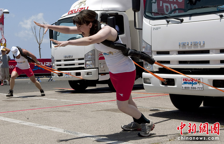 6月8日,以色列在海濱城市特拉維夫舉行了拉卡車大賽。比賽要求將一臺(tái)7.5噸的卡車?yán)?0米以外,用時(shí)最短者為勝者。該項(xiàng)賽事不但吸引了世界上眾多男性大力士,更有許多女性大力士出戰(zhàn)。圖片來(lái)源:中國(guó)新聞網(wǎng)