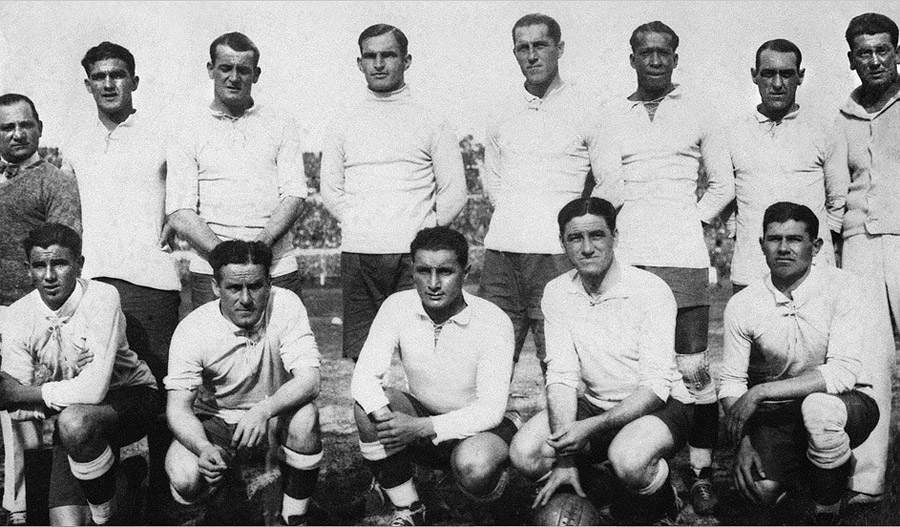 圖為首屆冠軍隊烏拉圭。第一屆世界杯參賽隊只有13支,包括4支歐洲球隊、8支南美洲球隊以及一支來自美國的代表隊,不過這屆賽事體現(xiàn)了當(dāng)時世界足壇的最高水平。東道主烏拉圭隊4比2戰(zhàn)勝阿根廷奪得首屆冠軍,首都蒙得維的亞慶祝球隊奪冠的活動持續(xù)了幾天幾夜。為了紀(jì)念這場勝利,決賽后的第二天(7月31日)被定為全國性節(jié)日。
