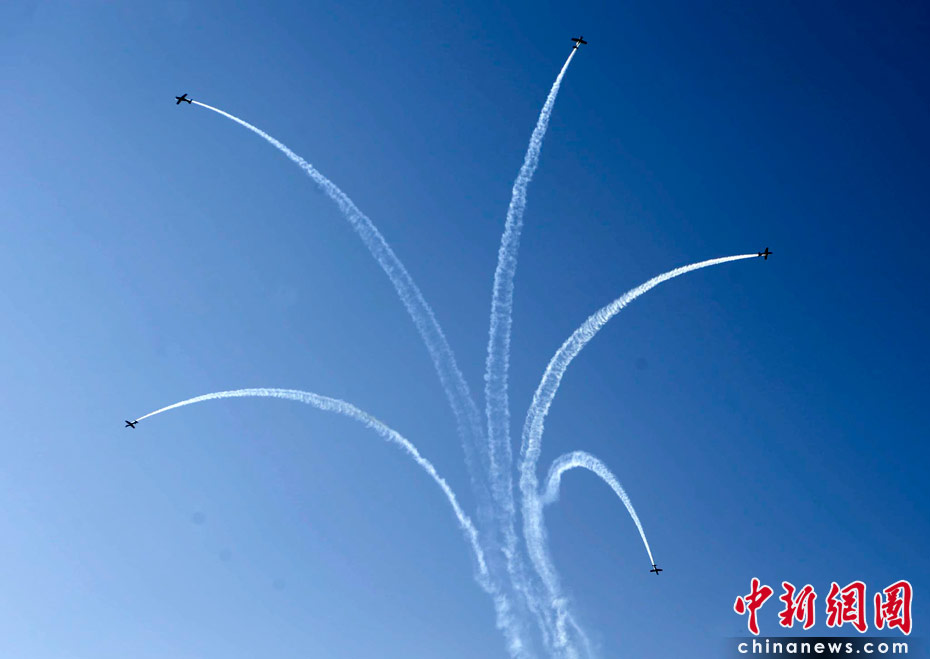 當(dāng)?shù)貢r(shí)間6月9日,南非約翰內(nèi)斯堡足球城,飛行表演隊(duì)在進(jìn)行演練。中新社發(fā) 廖攀 攝