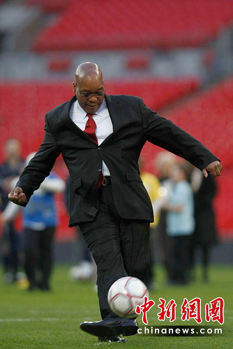 圖為2010年3月4日,英國倫敦,正在英國訪問的南非總統(tǒng)祖馬到溫布利大球場球場參觀,并展示了他的球技。