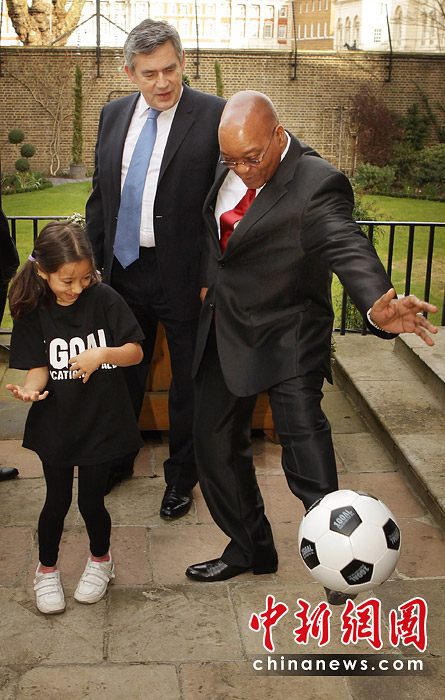 圖為2010年3月4日,英國倫敦,正在英國訪問的南非總統(tǒng)祖馬在唐寧街10號與英國首相布朗舉行會晤,其間還在露臺上跟小學生玩起了足球。今年世界杯將于6月在南非舉行。