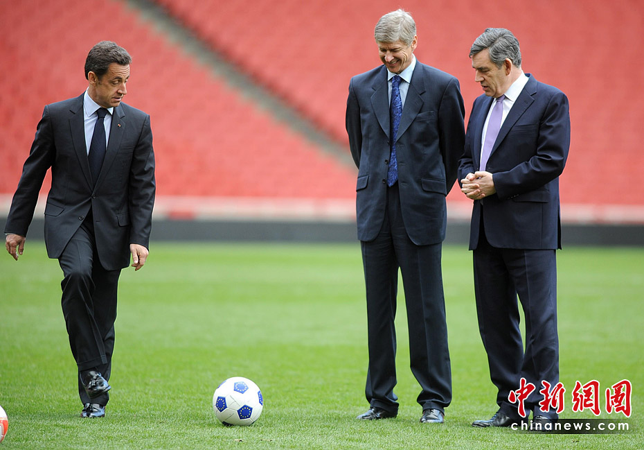 圖為2008年3月27日,法國(guó)總統(tǒng)薩科齊來到倫敦酋長(zhǎng)球場(chǎng),在英國(guó)首相布朗和英超勁旅阿森納隊(duì)主教練溫格面前“秀”了一下腳法。