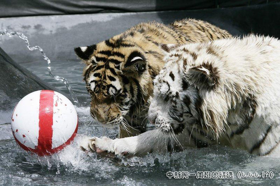 6月7日,美國南卡羅來納州美特爾海灘,在世界杯即將開幕之際,一歲的小白虎Sundaram和孟加拉虎Mukti率先在水里上演了一出足球大戲。英格蘭隊(duì)首戰(zhàn)將對陣美國隊(duì),因此足球外側(cè)也被印上了英格蘭旗的標(biāo)志。圖片來源:CFP>>點(diǎn)擊觀看詳細(xì)內(nèi)容