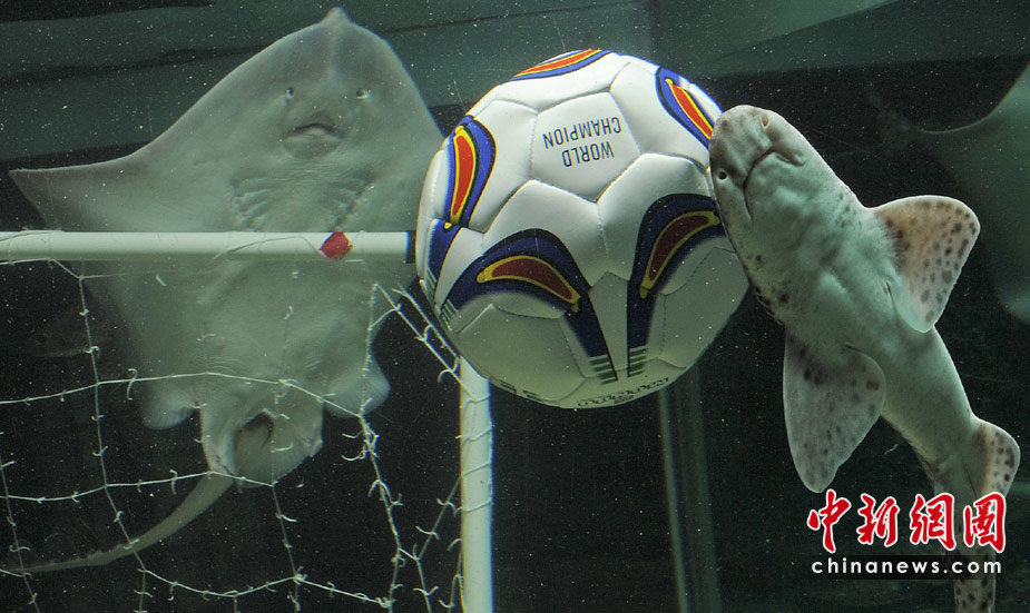 當(dāng)?shù)貢r間6月15日,德國北部,水族館里的海洋生物爭搶填滿飼料的足球。