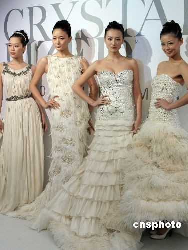 11月18日,一場(chǎng)時(shí)尚婚禮匯展在上海舉行,耀眼奪目的水晶婚紗禮服吸引了不少參觀者的“眼球”。圖為模特展示水晶婚紗禮服。中新社發(fā) 湯彥俊 攝