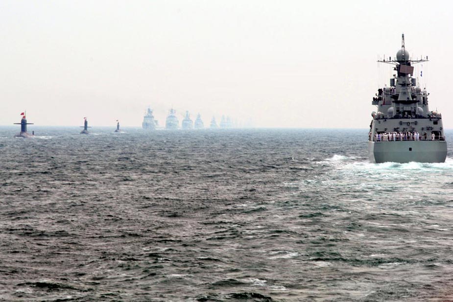4月23日下午,為紀(jì)念中國(guó)人民解放軍海軍成立60周年而舉行的海上閱兵在青島附近黃海海域舉行。海上檢閱式分兩個(gè)階段,第一階段為海上分列式,檢閱中國(guó)海軍的艦艇和飛機(jī);第二階段為海上閱兵式,檢閱來自14個(gè)國(guó)家的21艘艦艇。圖為接受檢閱的中國(guó)海軍潛艇編隊(duì)、水面艦艇編隊(duì)。 中新社發(fā) 宋吉河 攝