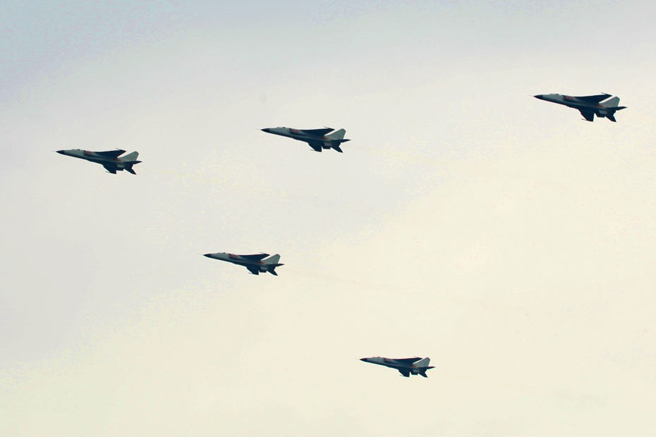 4月23日下午,為紀(jì)念中國人民解放軍海軍成立60周年而舉行的海上閱兵在青島附近黃海海域舉行。海上檢閱式分兩個(gè)階段,第一階段為海上分列式,檢閱中國海軍的艦艇和飛機(jī);第二階段為海上閱兵式,檢閱來自14個(gè)國家的21艘艦艇。圖為海軍航空兵震撼登場。中新社發(fā) 宋吉河 攝